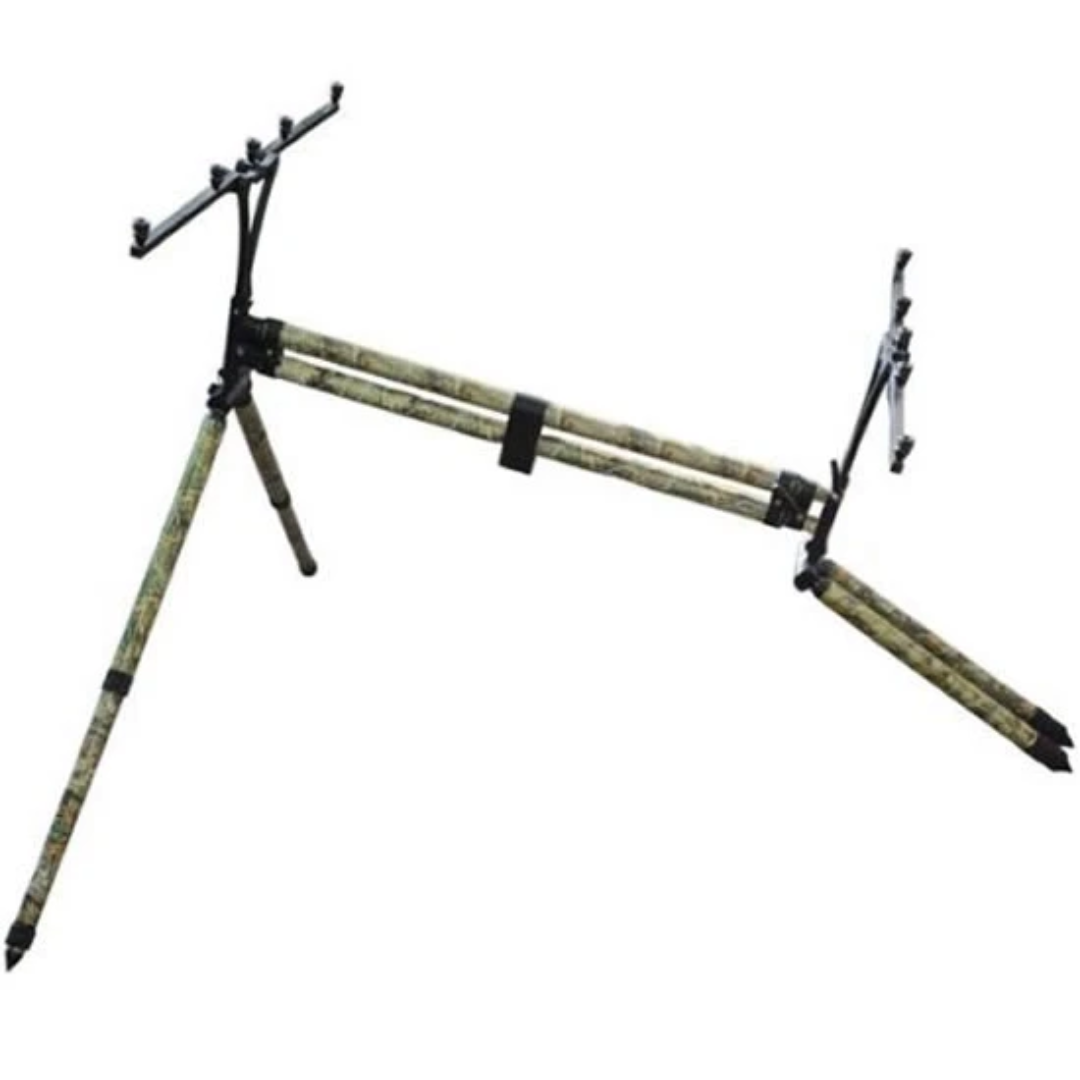 El rod pod está fabricado íntegramente en aluminio endurecido, un material ligero pero extremadamente resistente. Equipado con barras de buzz bars retráctiles que admiten 3 o 4 cañas, incluso con los carretes más grandes utilizados en la pesca de carpas. La distancia entre los postes es de 25 cm para 4 cañas o de 40 cm para 3 cañas. Los buzz bars están equipadas con conectores rápidos magnéticos. El rod pod puede extenderse hasta una distancia máxima de 160 cm entre buzz bars