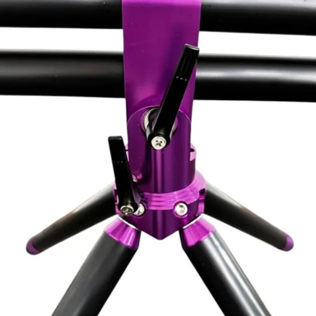 El tripode está equipado con 4 patas telescópicas que pueden usarse en el formato clásico (2 delanteras y 2 traseras) o en el formato piramidal, con las 4 patas montadas en la tuerca central. La altura máxima de los buzzbars es de 160 cm con el tripode orientado hacia el cielo.